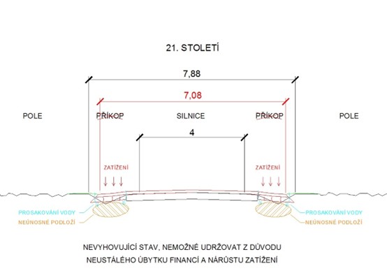 Řešením může být pouze generální rekonstrukce vozovek s úplnou sanací neúnosných okrajů vozovek, výkupem části okolních pozemků a znovuzřízením příkopů a návazného odvodnění.