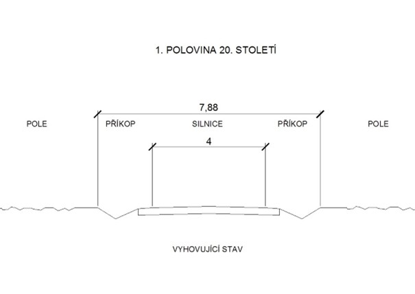 Typická stará silnice s kvalitně provedenou středovou částí – původní štětovou cestou.