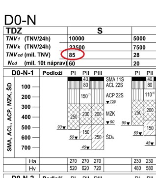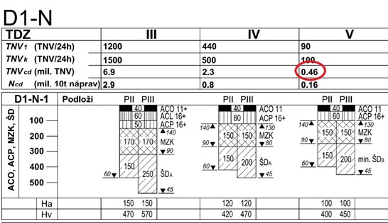 - TNVk – Dopravní zatížení TNV za 24 hodin na konci životnosti vozovky (předpokládá se většinou mírný nárůst).