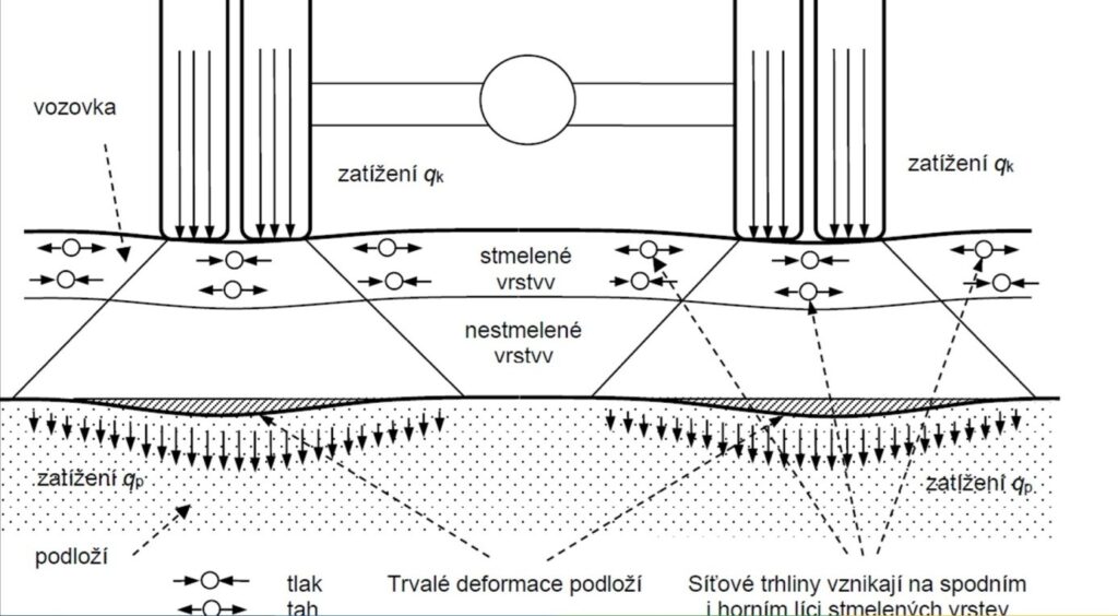 Namáhaná silnice na rozdíl od mostu nemá kam spadnout – leží přece na zemi. Znamená to tedy, že unese všechno? Zcela jistě ne. Kola vozidla a tedy hmotnost vozidel působí na vozovku (= odborný výraz pro silnici) téměř bodově – přesněji v malé ploše. Zatížení (= hmotnost vozidla) je přes konstrukční vrstvy vozovky rozprostřeno (= roznášeno) do plochy podloží vozovky (= zemina, písek, skála, prostě to co je pod vozovkou). Roznášení hmotnosti lze v řezu znázornit jako část (= úseč) kužele, který čím je kužel vyšší (= tloušťka konstrukčních vrstev vozovky je větší), tím se roznáší zatížení od kol do větší plochy podloží. Podloží se chová podle toho o jaký materiál se jedná, ale obecně lze říci – částečně pružně (= zatlačím, povolím a materiál se vrátí zpět), – částečně plasticky (= zatlačím, povolím a materiál už se nevrátí zpět). Plastické deformace (= trvalé = vozovku poškozující) vozovky jsou závislé na tloušťce a kvalitě konstrukčních vrstev vozovky. Čím tlustší je vozovka = čím tlustší jsou její konstrukční vrstvy = tím větší je roznášecí plocha působící na podloží = tím menší jsou trvalé (= poškozující) deformace vozovky. Konstrukční vrstvy (= obalované kamenivo (tzv. „asfalt“), speciální beton, kamenivo různé velikosti atd.) jsou samozřejmě drahé = materiál, doprava, pokládka, hutnění (= válcování).